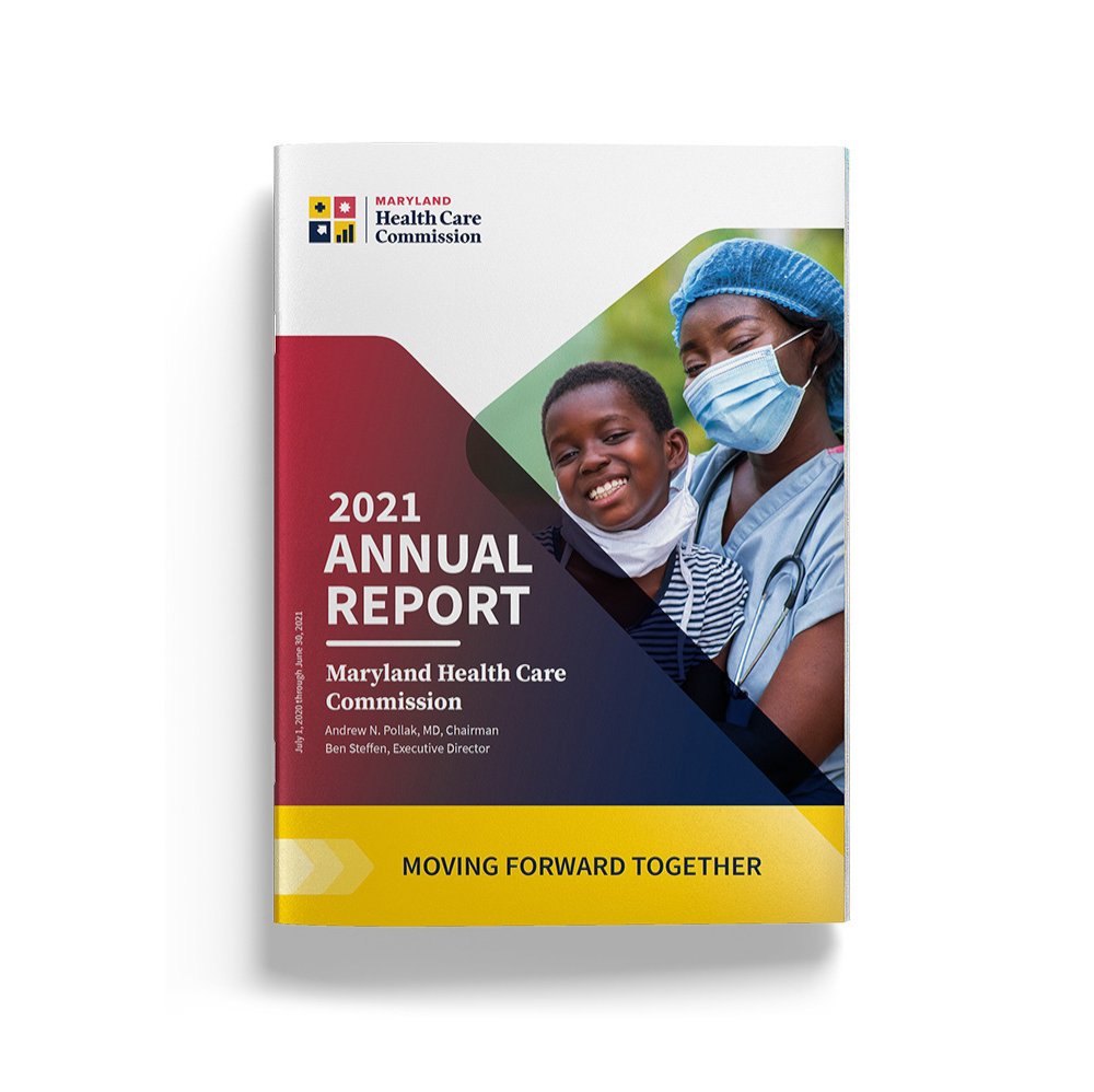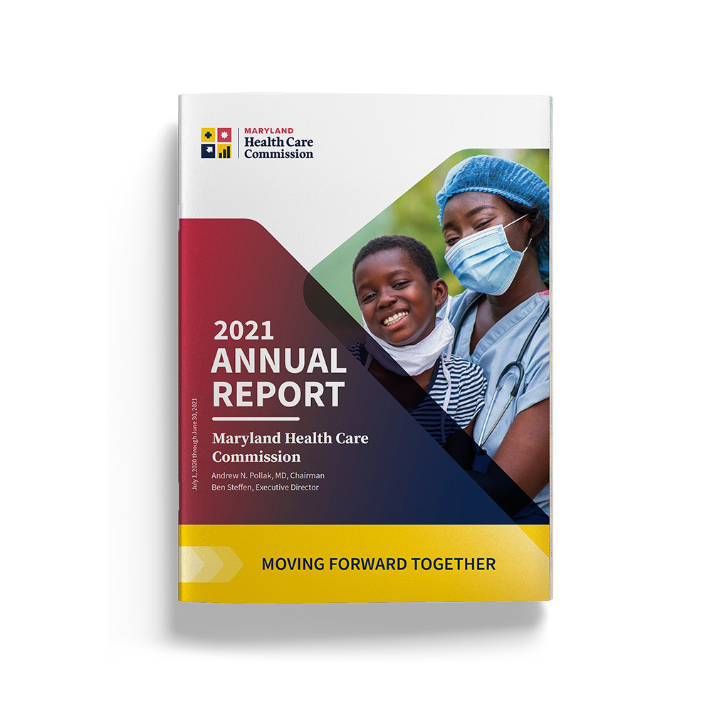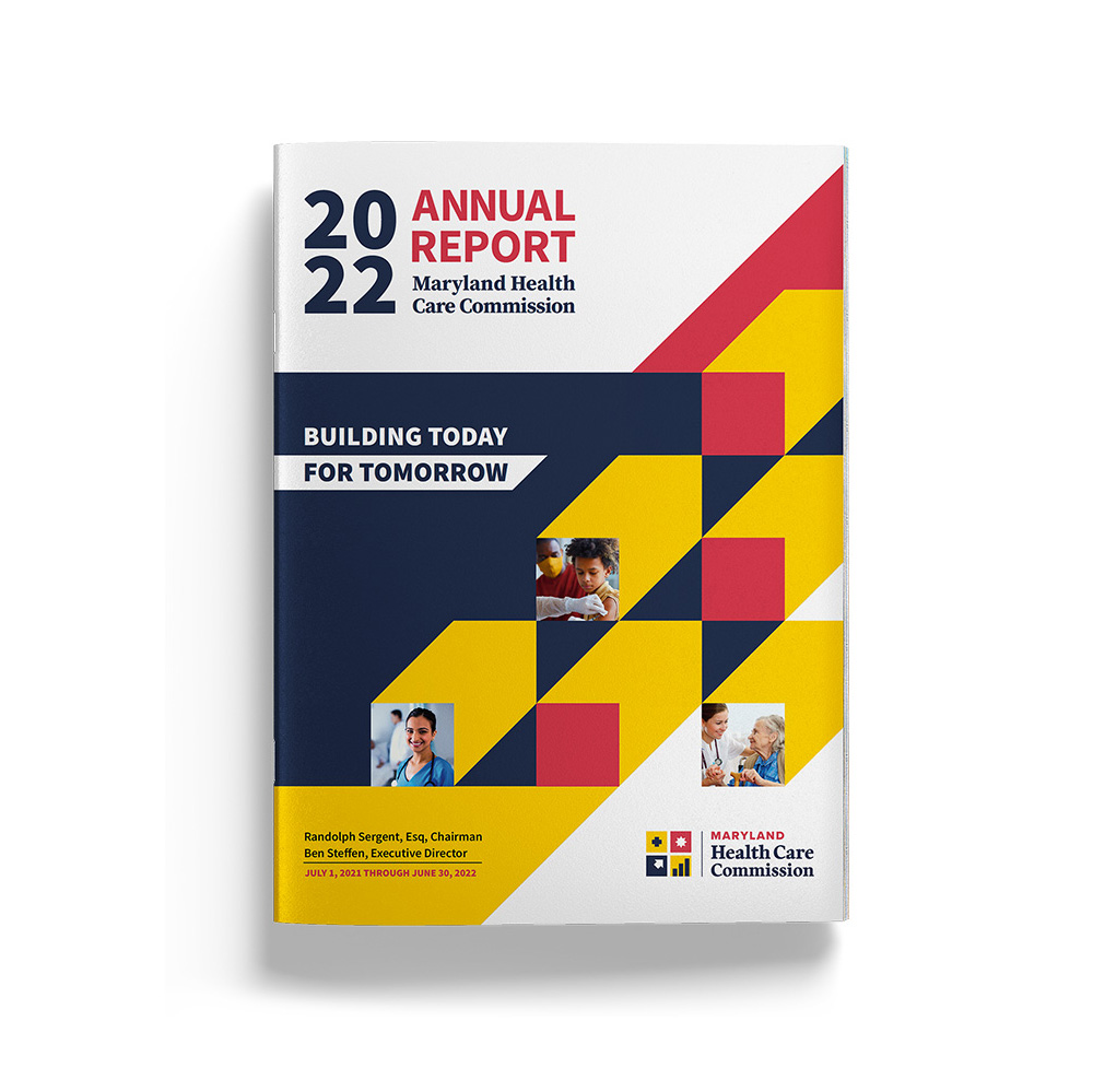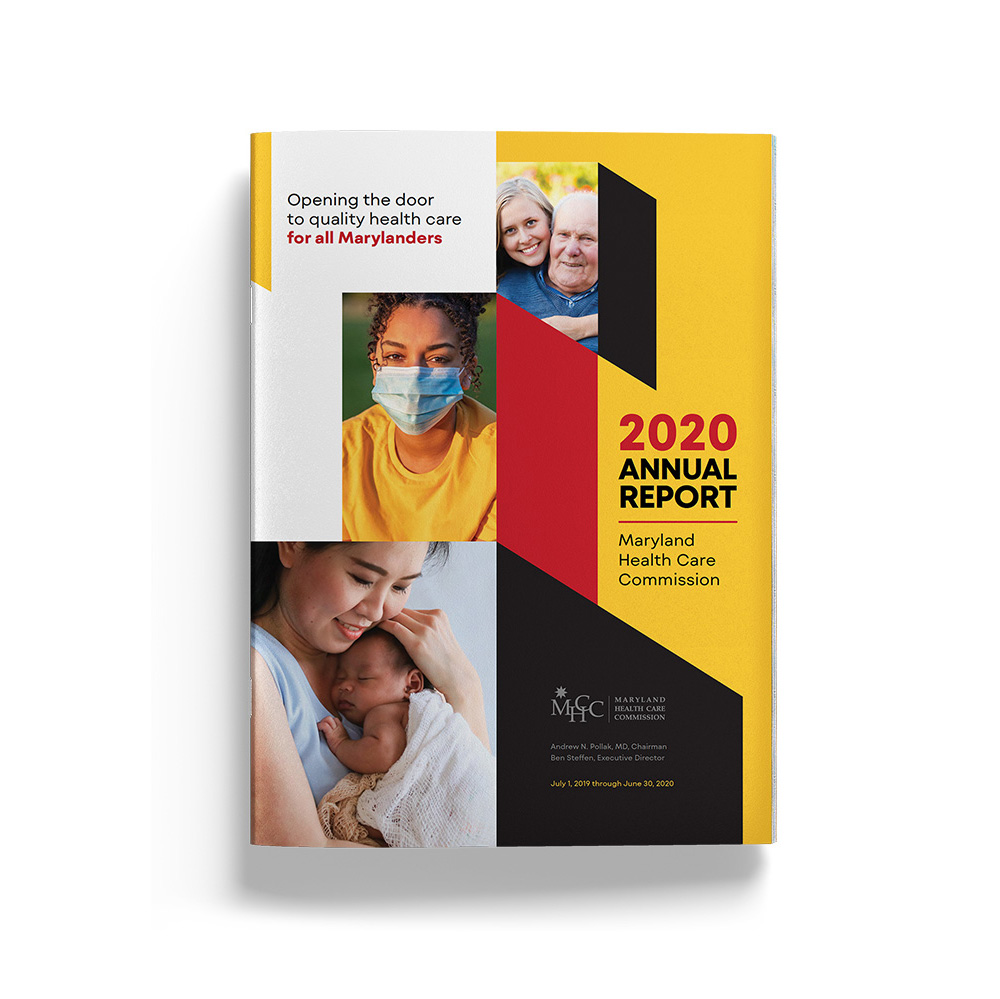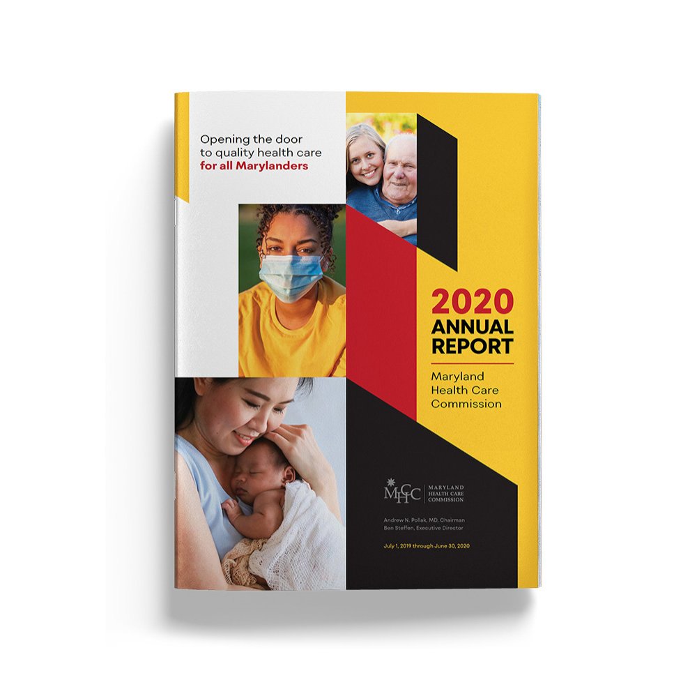 The 2020 annual report focused on health care accessibility for all with a theme of Opening Doors. This design features abstract open door graphics throughout the report to keep the theme ever-present for the reader. The design features the primary colors from the Maryland flag and imagery representing all Marylanders.