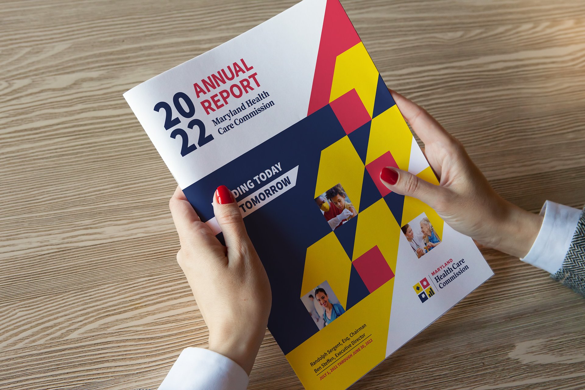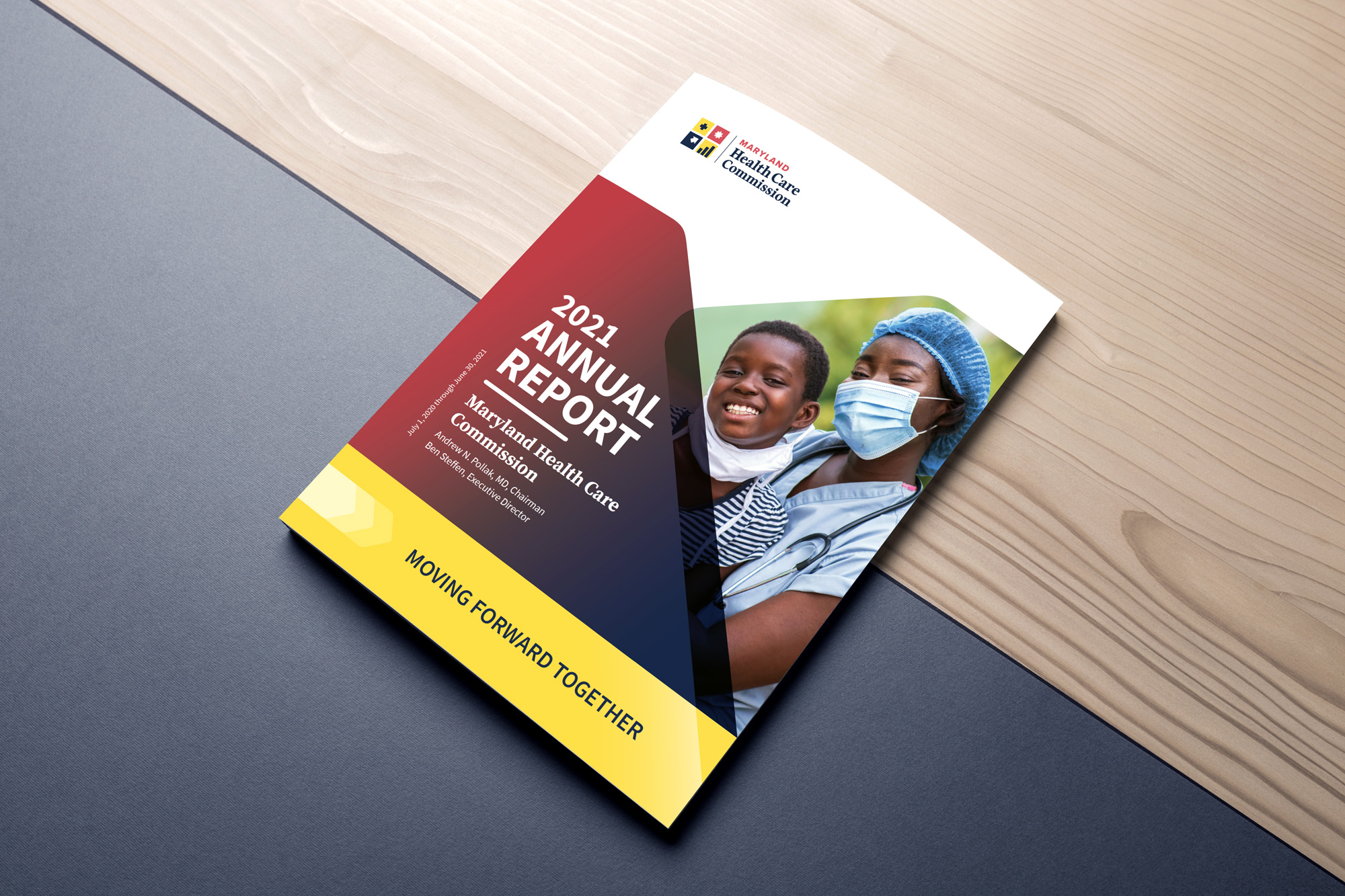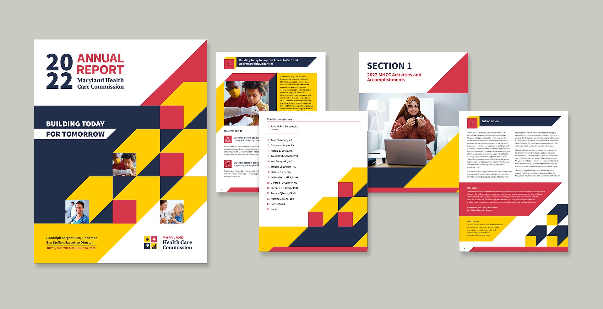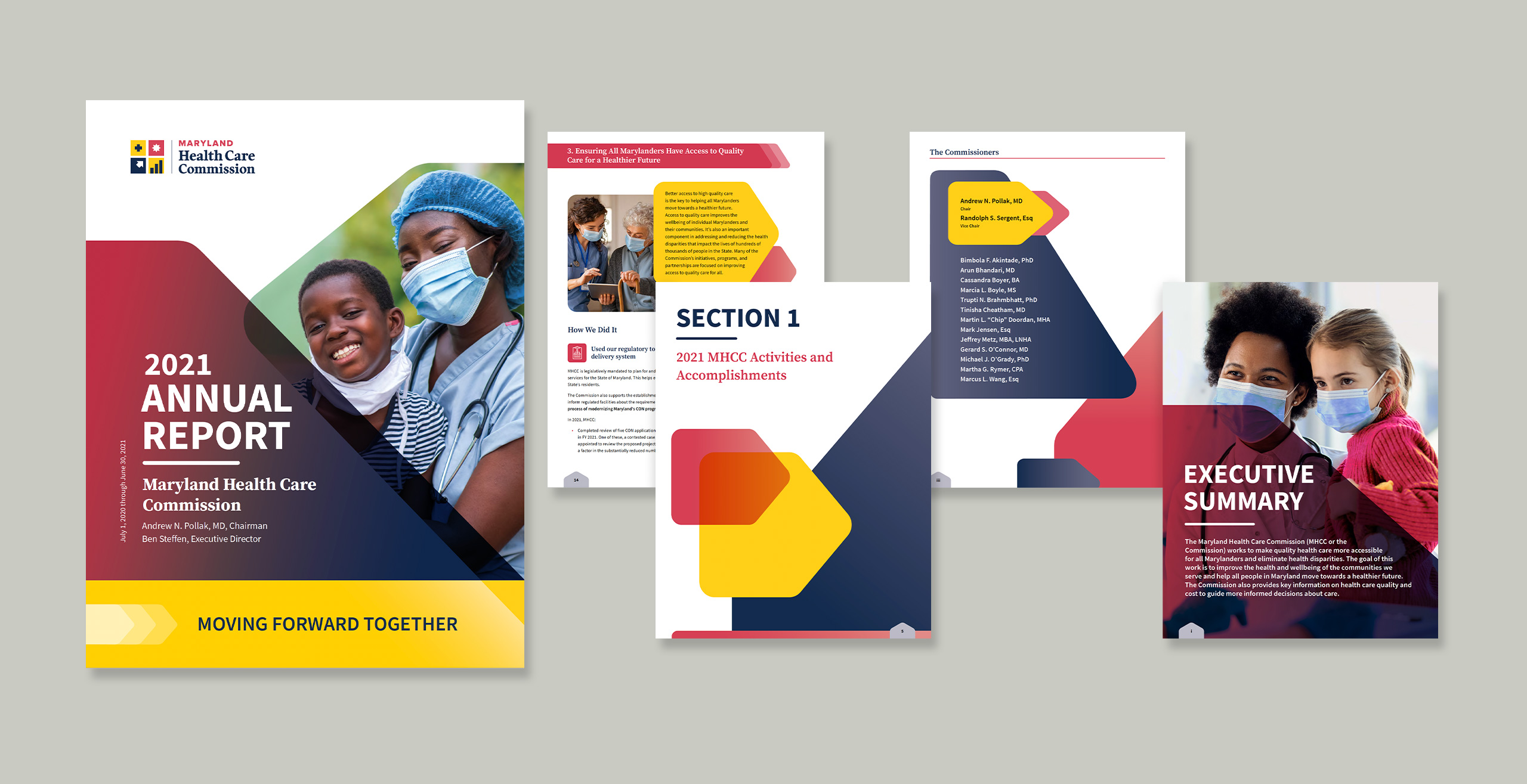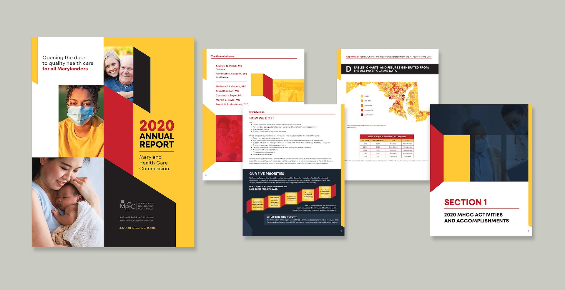 The 2020 annual report focused on health care accessibility for all with a theme of Opening Doors. This design features abstract open door graphics throughout the report to keep the theme ever-present for the reader. The design features the primary colors from the Maryland flag and imagery representing all Marylanders.