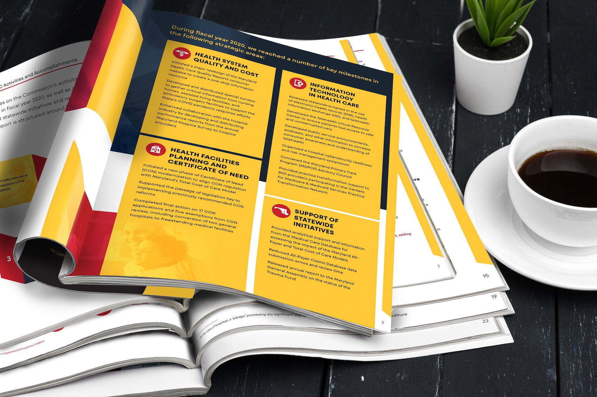 The Maryland Health Care Commission provides an annual report outlining the work they have done, the goals they have set, and their allocation of funding. In years 2020, 2021, and 2022 (2023 forthcoming), I designed this report to better guide the reader through nearly fifty text-heavy pages.